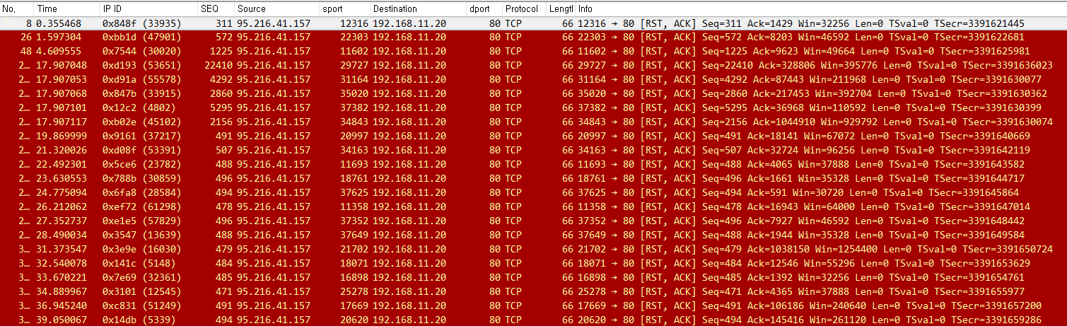 바이러스 토탈의 악성URL 검사를 제외하고 확인한 URL Scan 사이트와 Crawler 프로그램 모두 공통적으로 빠른 시간(세션 개시 후 절대시간 또는 적은 SEQ)내 많은 RST을 보낸다.