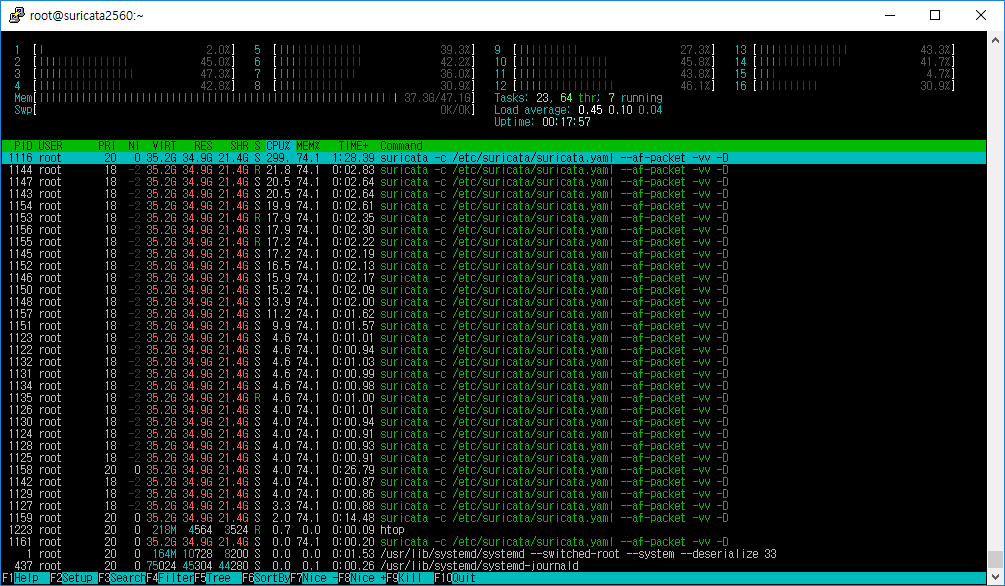 오히려 시스템의 일부 core를 management로 사용하고 이와 동일하게 suricata.yaml의 affinity 또한 동일하게 맞춰주었을 때 안정적인 context_sw와 CPU 사용율, 우수한 Throughput을 달성함