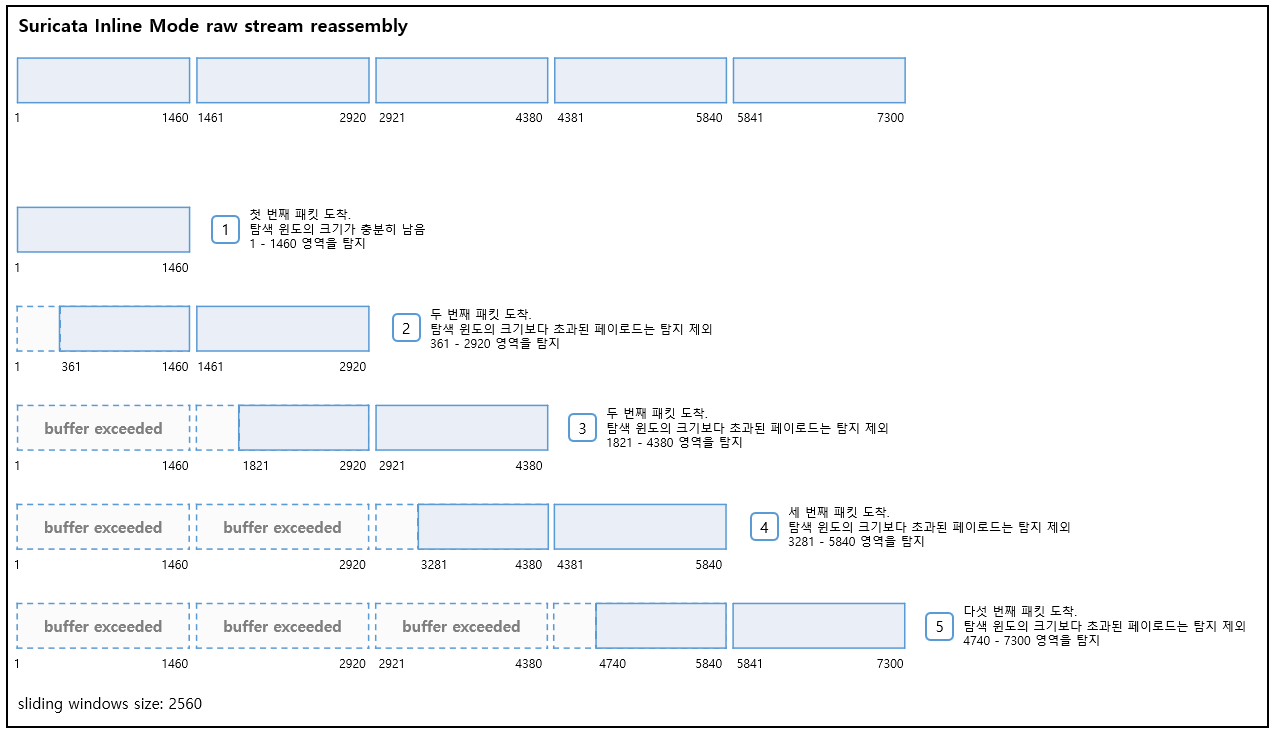 그림 1은 간단한 표현을 위해 chunk-size가 2560으로 고정 값이며, 모든 TCP segment 사이즈가 1460 동일한 상태이다. 그림 1에서 알 수 있듯이, chunk-size를 초과하는 버퍼의 앞 부분은 cut-off가 된다. chunk-size가 2560으로 설정된 상태에는 탐지하려는 최대 페이로드의 길이는 2560이 될 수 있지만, 2561이상은 존재 할 수 없다.